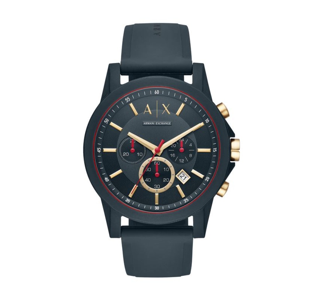 Este reloj para hombre de Armani Exchange tiene una esfera cronógrafo azul con agujas e índices en tono dorado y una caja de silicona azul mate con correas de silicona a juego.